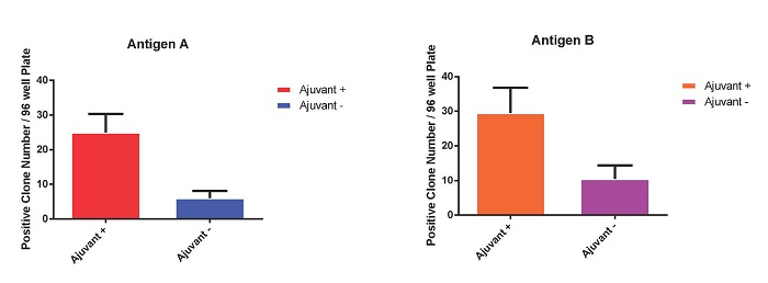 本公司的杂交瘤阳性克隆增强佐剂是目前全世界行业内唯一可以提高克隆阳性率的佐剂产品。如果配合细胞电融合仪使用,可以在提高克隆得率5-10倍的同时,经过多轮免疫后通过刺激激活,提升2倍B细胞数量,提高阳性比率5~10倍。下图是本产品的使用效果图示: