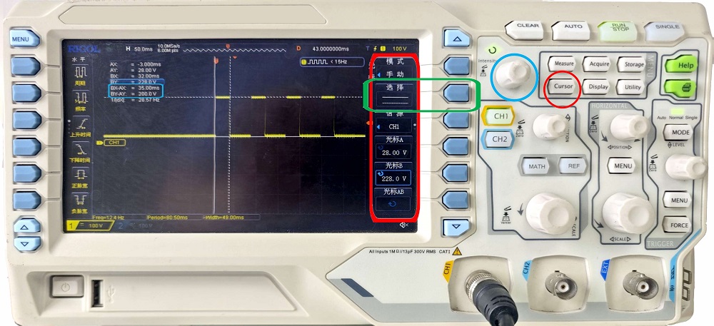 3. 来回旋转篮圈的旋钮,使得光标A与基准线重合,光标B与方波电压脉冲线或者时间点重合。读取显示屏左上角蓝框内的数据,By-Ay和Bx-Ax的数值,就是对应的电压数值和持续时间数值。